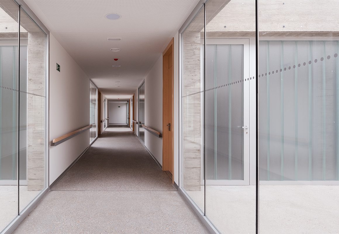 Una vez en la superficie, el estrato emergente se excava para albergar los diferentes espacios que se dividen en cuatro zonas según sus niveles de privacidad y uso. Por un lado, dos grandes muros de contención se extienden hacia el exterior para marcar la entrada y separar los espacios públicos (diferenciados a su vez en administrativo y salas polivalentes) de los privados. Mientras que estos últimos se articulan alrededor de dos pasillos de gran anchura, aunque diversa para caracterizarlos y fomentar la orientación, concebidos como las estancias más importantes dentro del funcionamiento terapéutico del Centro. A partir de cada uno de ellos se accede al resto de espacios privados, uno da acceso a las estancias de uso frecuentes (aulas, baños geriátricos, patios-estancias…) y el otro a los espacios ocasionales (sala de estar, comedor…). Todos ellos proyectados según las necesidades específicas de personas con la enfermedad de Alzheimer. Así se desarrolla un esquema claro y rotundo que optimiza el funcionamiento del edificio, permitiendo el uso simultáneo, sencillo e independiente de las diferentes zonas, y el aprovechamiento de sus recursos energéticos.