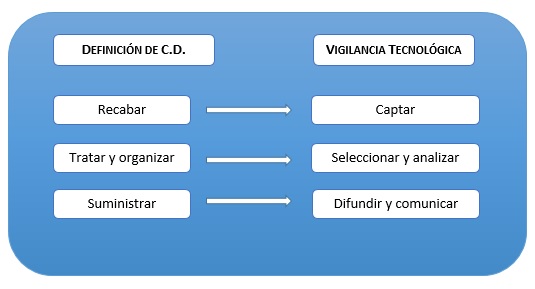 Tanto los centros de documentación como los procesos vigilancia tecnológica se equiparan en sus funciones, es decir, que las fases de ambas responden de forma de 1 a 1 entre sí.