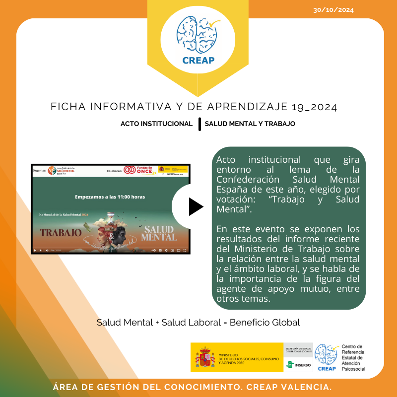 El vídeo es la grabación del acto institucional que gira en torno al lema de la Confederación Salud Mental España de este año, elegido por votación: «Trabajo y Salud Mental».