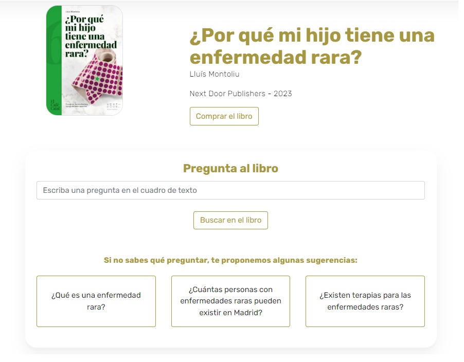 Este libro, publicado por NextDoor Publishers en febrero de 2023, se ha convertido este año en una inteligencia artificial que responde a cualquier pregunta relacionada con los contenidos incluidos en el mismo gracias al trabajo de la Fundación 29, presidida por Julián Isla, miembro del Comité Científico Asesor Externo del Ciberer. La IA del libro, con una sencilla interfaz, usa internamente el algoritmo del modelo de lenguaje GPT-4 de OpenAI y puede responder de forma breve o extensa a las preguntas de cualquier tema tratado en el libro. "Es una nueva aplicación, basada en IA, que es capaz de transmitir los contenidos del libro de forma sencilla, práctica y directa", destaca Lluis Montoliu.
