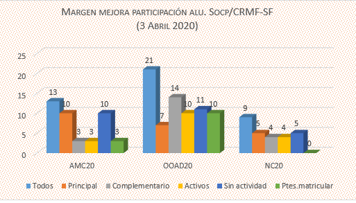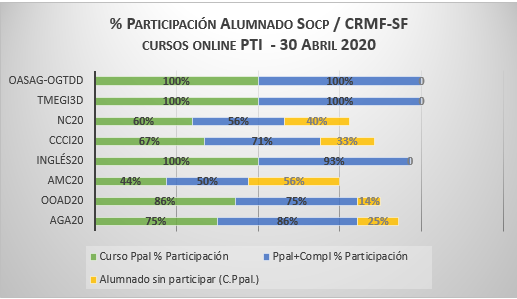 La respuesta del alumnado es buena. El 84% se conectó durante la 1º semana, pero seguimos trabajando y aspirando a la incorporación del 100% del alumnado, en el proceso de enseñanza y aprendizaje online del SOCP del CRMF-SF.