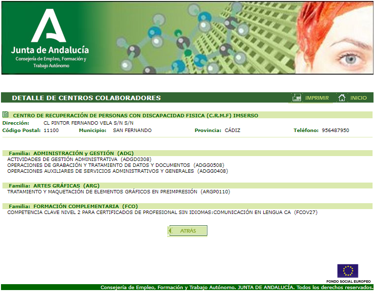 - Acreditación de la Junta de Andalucía para impartir en el CRMF-Imserso de San Fernando, dos nuevas especialidades formativas conducentes a la obtención de certificados de profesionalidad